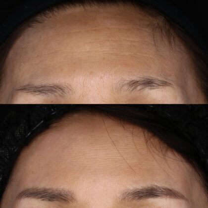これくらいの刻まれたしわでも、ボトックスを定期的(3~4ヶ月ごと)にすると、表情をつくる時だけではなく刻まれたしわも浅くなってきます。