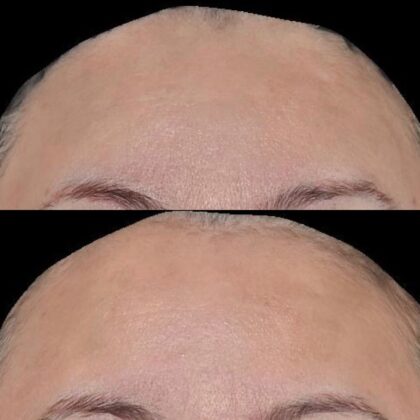 施術前は、眉上から額中央にかけて凹みがあり、 額の凹凸と横ジワが目立つ状態でした。